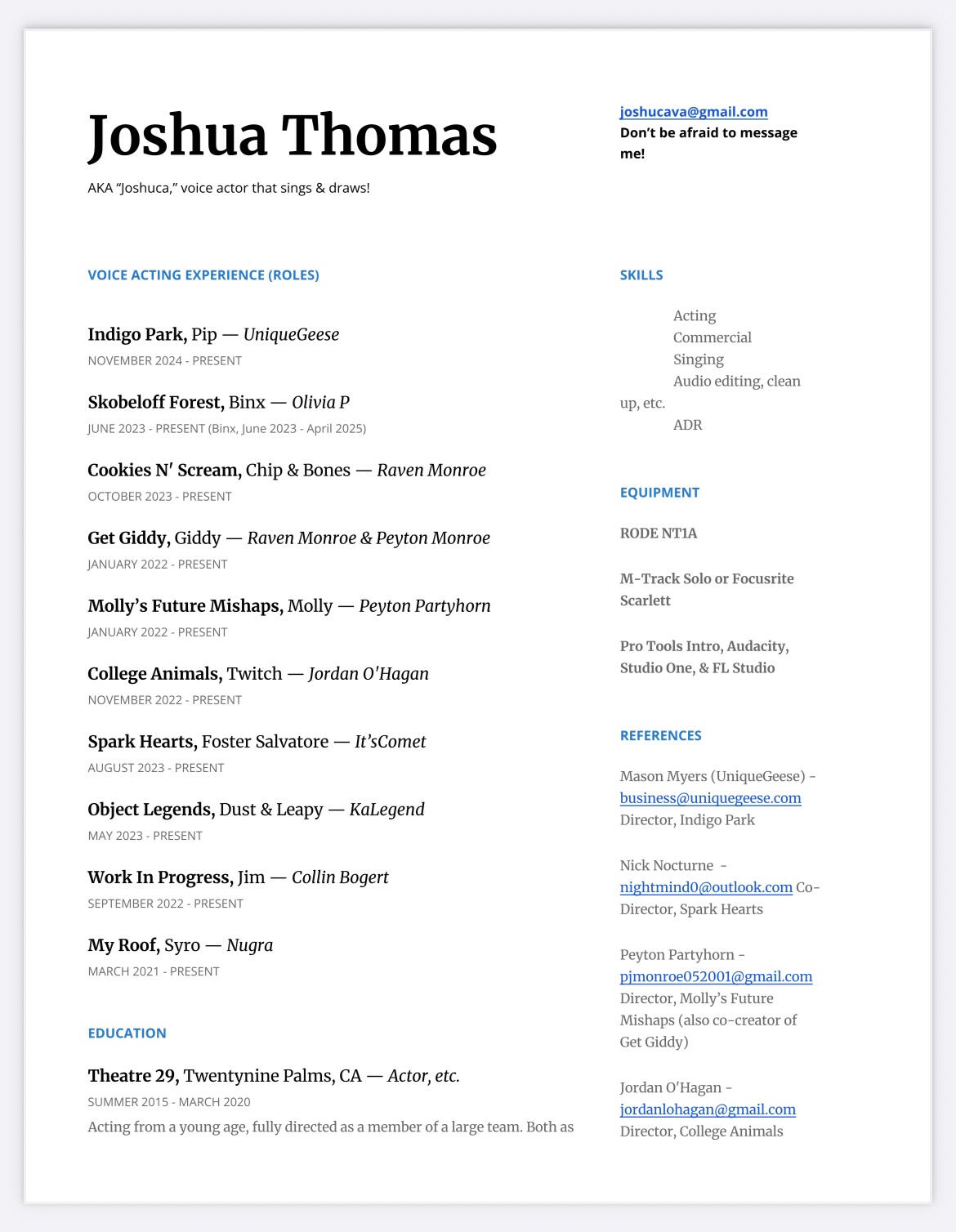 Hello, I'm Joshuca! An artist and voice actor based out of Los Angeles that began acting in summer of 2015. Since then, I've been a part of many animated projects, comics, as well as music!You can hear me voicing in many roles such as Pip in “Indigo Park," Molly from "Molly's Future Mishaps," as well as many more amazing projects!
